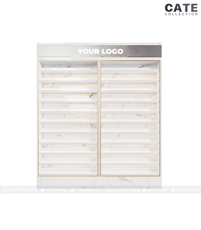Polish Rack | CATE Collection features a modern design with white marble finish and elegant gold trim, offering a professional and luxurious way to display nail polishes while optimizing space in your nail salon.