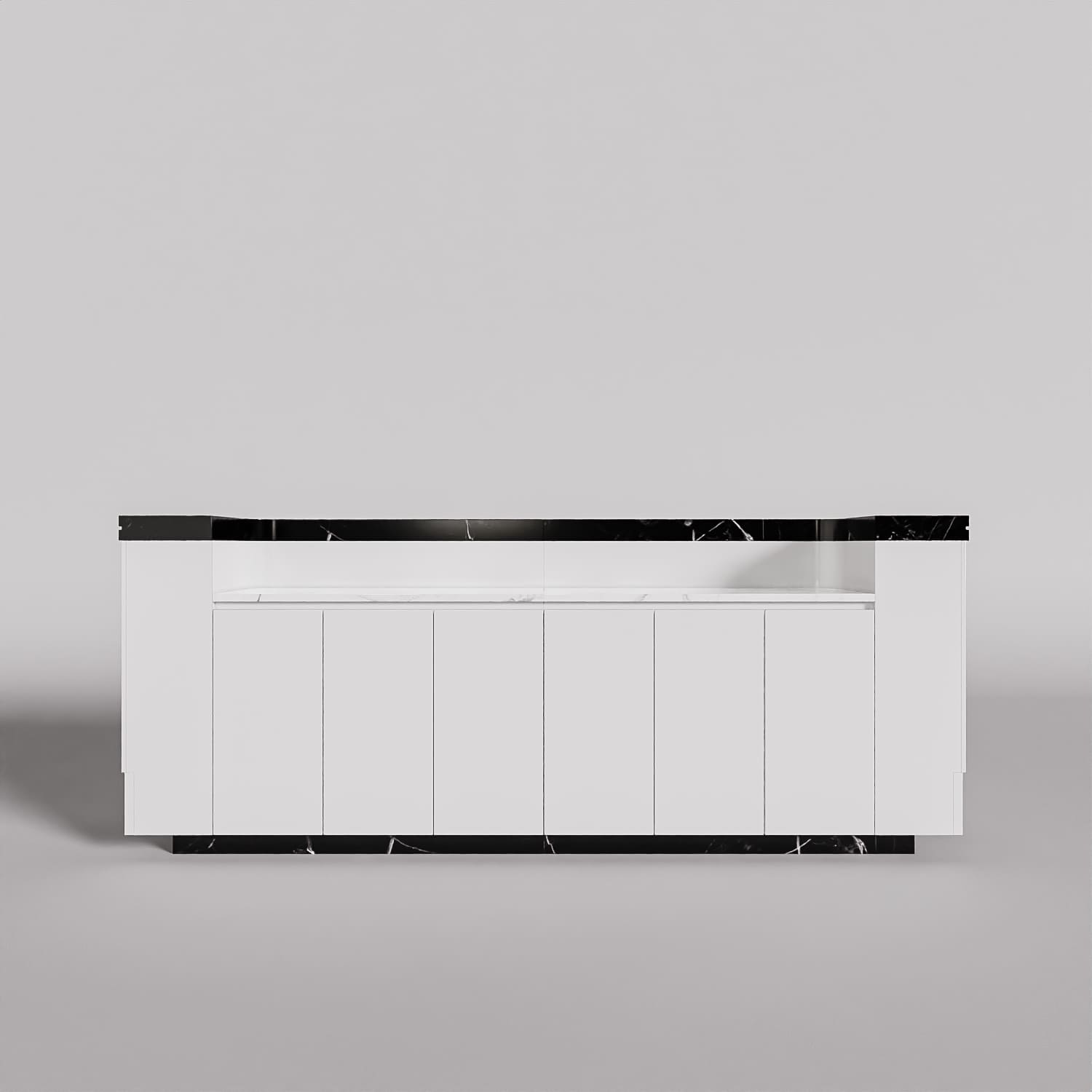 Phía sau quầy được trang bị hệ tủ lưu trữ thông minh, giúp sắp xếp gọn gàng và tiện lợi. Thiết kế tinh tế này hỗ trợ giữ không gian làm việc ngăn nắp, sạch sẽ và nâng cao hiệu quả vận hành.